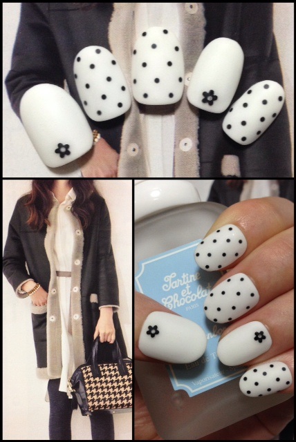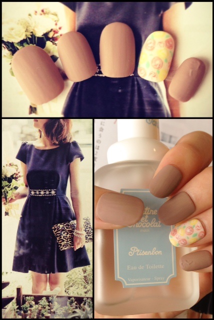 添付はパーティーネイルです。ブラウンの一色塗りと小花柄のマットネイルです。ブラウンをベージュなどに変えればオフィスでも使えると思います♪