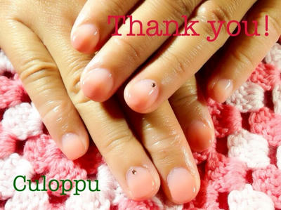 添付はお客様ネイルです。オレンジベージュのグラデーションです。小さいストーンをおいて、控えめですが華やかに仕上げています♪掲載を快諾してくださったKさま、ありがとうございました!