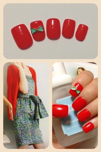 添付はレトロネイルです。真っ赤なネイルにリボンパーツを付けてみました♪