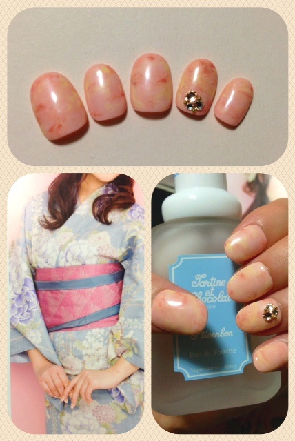 添付は浴衣用に作ったネイルです。落ち着いたマーブルにピンク系のストーンを置いてみました♪