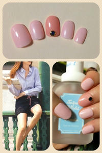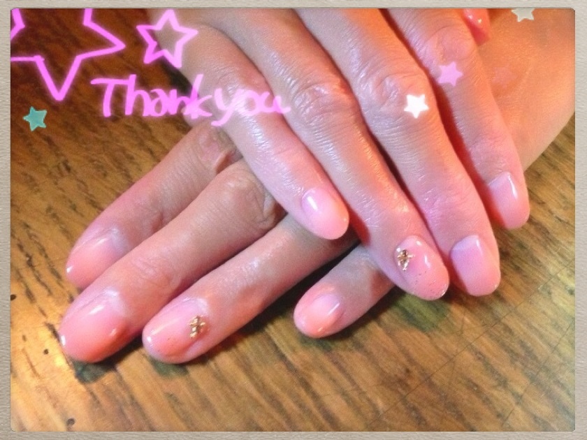 添付はオフィスネイルです。ピンクに手作りパーツを乗せてみました。天然石風に作ってみました。中にフィルムを埋め込んだので光の加減できらきらします♪