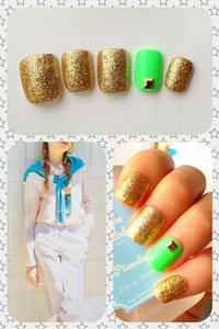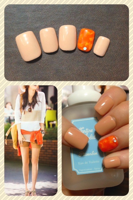 添付はオフィスネイルです。お洋服の配色がキレイだったのでそのままネイルに応用してみました。オレンジはタイダイ柄にオパールのストーンを置いています♪
