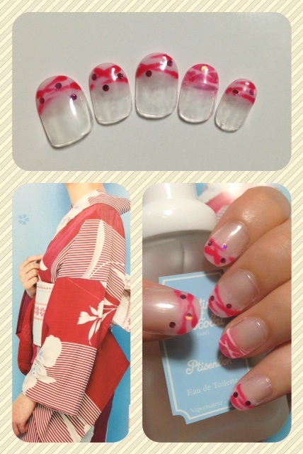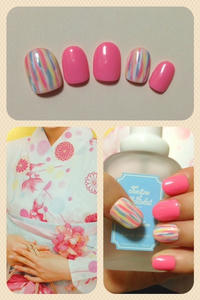 添付は浴衣用に作ったネイルです。ピンクの一色塗りに、アクセントで手描きストライプをいれてみました♪