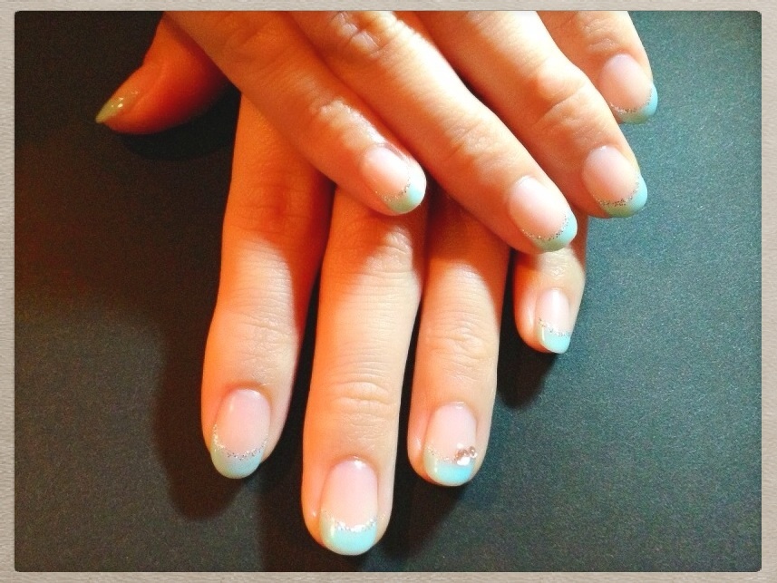添付はお客さまネイルです。柔らかいブルーのフレンチです。夏らしく出来上がりました。掲載を快諾してくださったTさま、ありがとうございました!