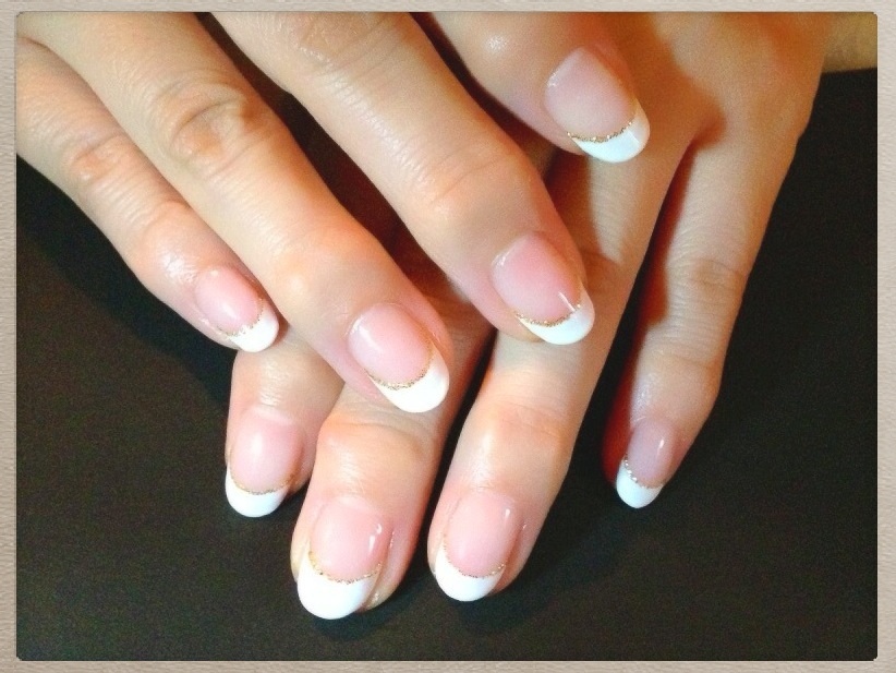 添付はお客さまネイルです。王道白フレンチです。ゴールドのラメでラインキュッと引きました。掲載を快諾してくださったHさま、ありがとうございました!