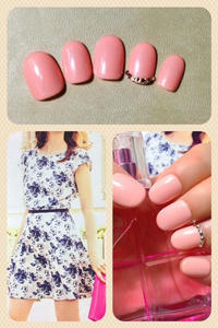 添付はオフィスネイルです。ピンクベージュの一色塗りに、一本小さいストーンを並べてみました。パーティー用にも使えると思います♪