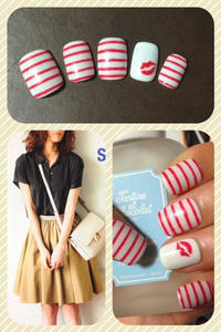 添付はボーダー柄のマリンネイルです。アクセントにキスマークを入れて目指せ肉食!砂肝が食べたいですね(^ ^)