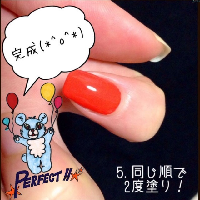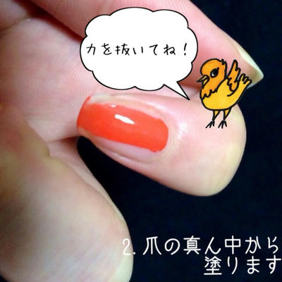 1度塗りと同じ順番で塗っていきます。2度塗りは少しマニキュアの量を多めに塗ってみてください。色むらを消す感じです。このときも力を入れないようにしましょう。力が入りすぎると下のマニキュアを削ってしまいます(-_-)