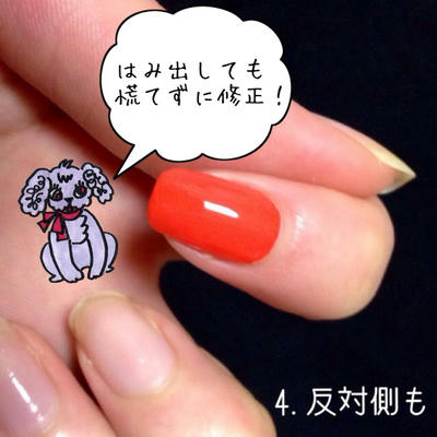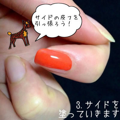 同様に反対側も塗っていきます。はみ出した場合はつまようじなど先の細い棒に除光液を付けて修正しましょう。修正も力を入れないようにしましょう!100円ショップやドラッグストアなどに専用の棒が売っています(*^_^*)