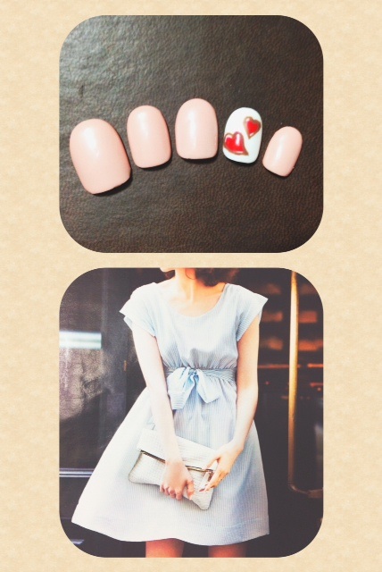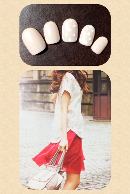添付はオフィスネイルです。赤いスカートが印象的だったのでネイルは控えめに。肌馴染みのいいベージュにひっそりドットを忍ばせてみました。
