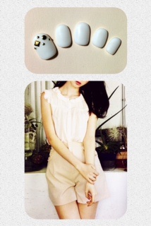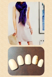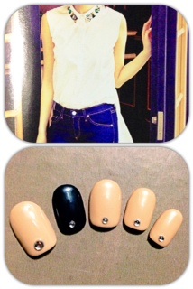 添付はパーティーネイルです。ストーンとブリオンで指輪のようにしてみました。縦のラインで指長効果です♪