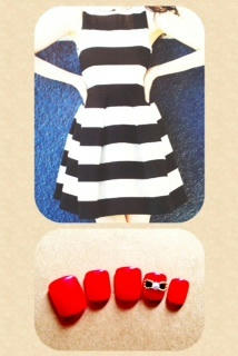 添付は一度はやってみたい真っ赤なネイルです。爪が長いとちょっと魔女のようかな〜と思ったので短い爪に。ポイントにストーンとブリオンでリボンを作ってみました♪