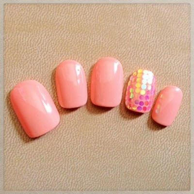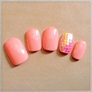 添付はオフィスネイルです。ピンクの中に1本だけホログラムを敷き詰めました。…ちょっぴり派手な気もしますね。普段はピンク一色、休日にホログラムを乗せる、というのもいいかも?!