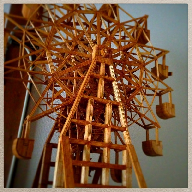 昨日、おばあちゃんの家で見つけたものがあります。コレ(↑)です。伯父さん作、爪楊枝で出来た観覧車です。「うお、うおおおおお!!!!」とテンションアップです。「ちゃんと動くんだよ〜」ということで動かしてもらいました。後ろにゼンマイとハンドルがあり、回すことができるのです。もちろんゼンマイもハンドルも爪楊枝です。度肝抜かされながらもなんだか見たことがあるような…と思ったら昔私も伯父さんからいただいていました。テーブルやイスをいただいた覚えがあります。なんでもこの観覧車は捨てるところを「もったいない!」ともらってきたそうです。まったくもってその通りです…!聞けば自宅のミニチュアも爪楊枝で作っているらしいです。今度伯父さんのお家に行くときはこそっと連れて行ってもらおうと企んでいます。