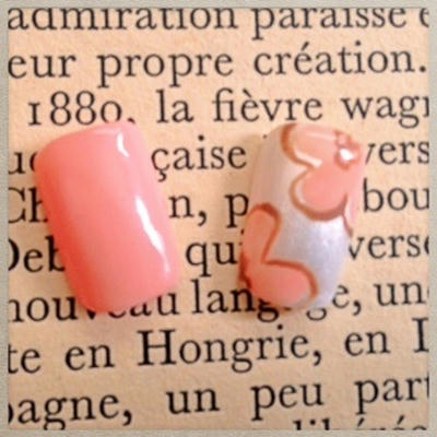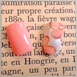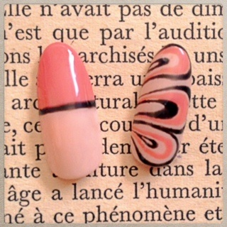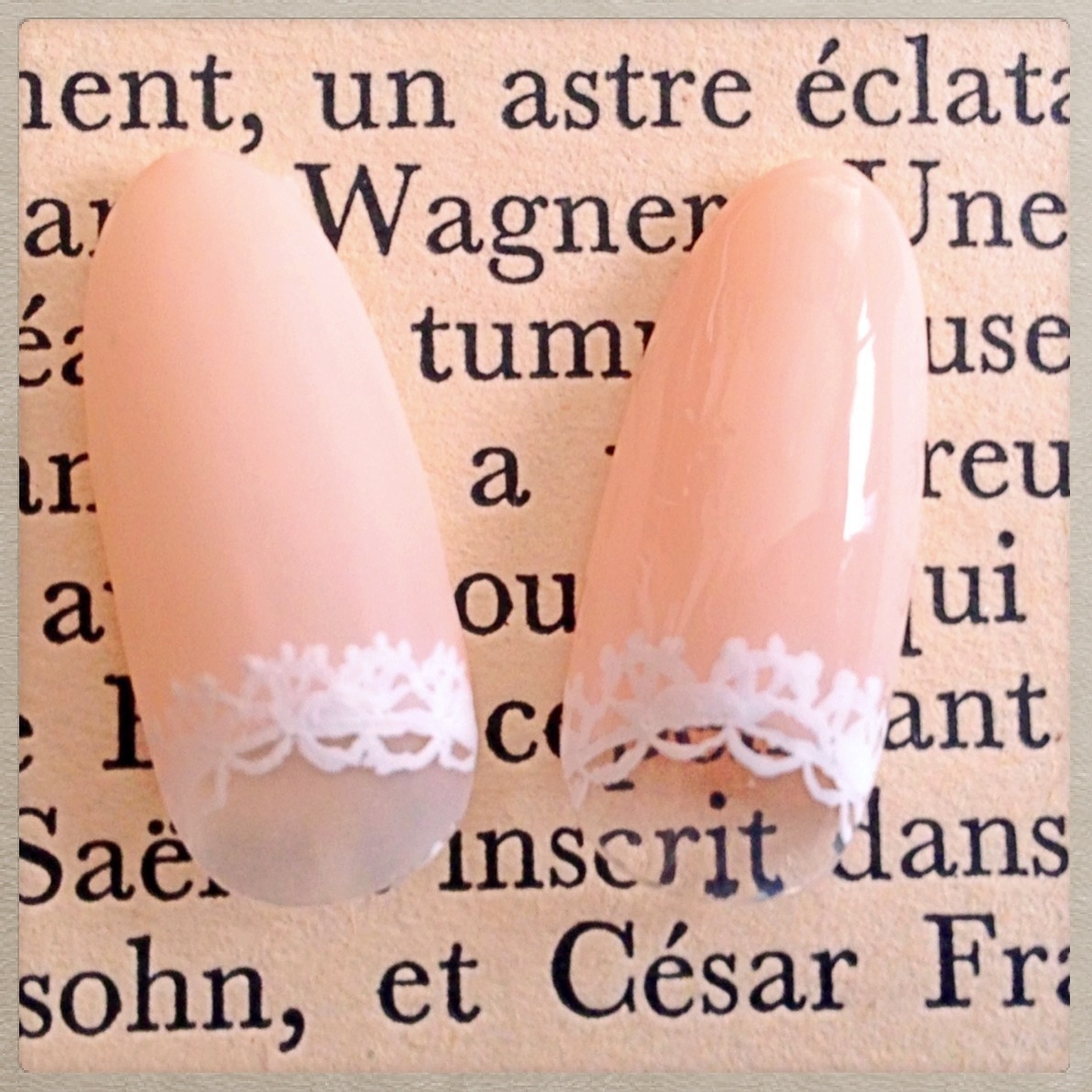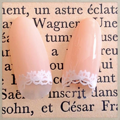 添付はオフィスネイルです。ベージュの逆フレンチに手描きレースをあしらってみました。左のチップはフロスティング加工をしています。
