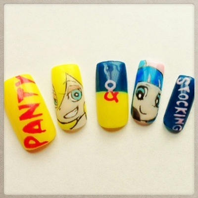 添付は気合を入れて作ってみた痛ネイルです。「パンティ&ストッキング」というアニメのヒロインふたりを描いてみました。このアニメはかわいい絵柄なのに下品極まりない内容なのであまりオススメはできませんが、女の子がウ○コまみれになっても笑える方にはおオススメです。