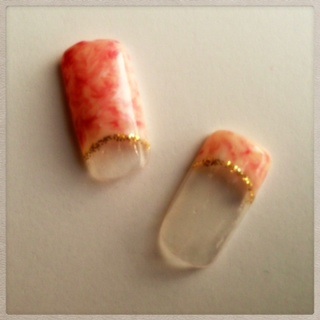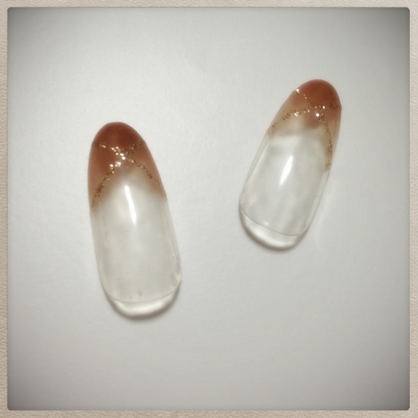 添付はオフィスネイルです。真っ直ぐな斜めフレンチを一度ずつ塗って重なったところとグラデーションになるようにしています。