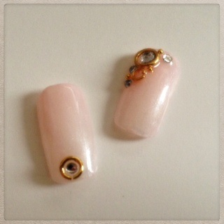 添付はパーティーネイルです。パールピンクのグラデーションにビジューでキラキラ。