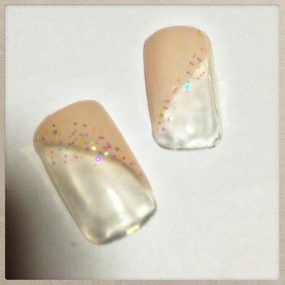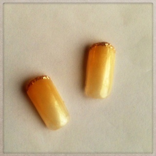 添付はオフィスネイルです。オレンジがかったベージュのグラデーションにラメでフチドリしてみました。
