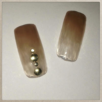 添付はオフィスネイルです。ブラウンのグラデーションにゴールドのスタッズでピシッと締めました。