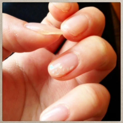 添付は塗り直した自分のネイルです。今回は一本だけ白のクラッシュシェルを置いてみました。控えめだけど少しきらきら。グラデーションとの組み合わせもオススメです。
