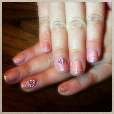添付はお客さまネイルです。ピンクベージュにシルバーのラメ。そしてポイントにハートのスタッズを乗せています。スタッズの中にはピンクのホロをいれています。実はこれ、お客さまのアイディアなのです!掲載を快諾してくださったN様、ありがとうございました!