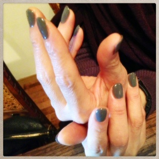 添付はお客さまネイルです。グレーの一色塗りに片手一本ずつラメで縦にラインを引きました。カッコ良く決まってます。掲載を快諾してくださったKさま、ありがとうございました!