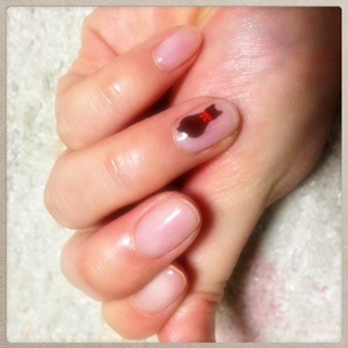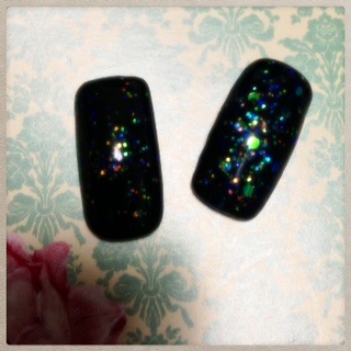 添付は黒ベースにオーロラグリッターをのせたネイルです。片方はブルーのホロものせています。
