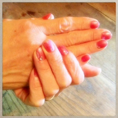 添付は本日のお客様ネイルです。濃いめのパールピンクにストーンを乗せています。手の形がとてもきれいな方です。憧れます。掲載を快諾してくださったK様、ありがとうございました!