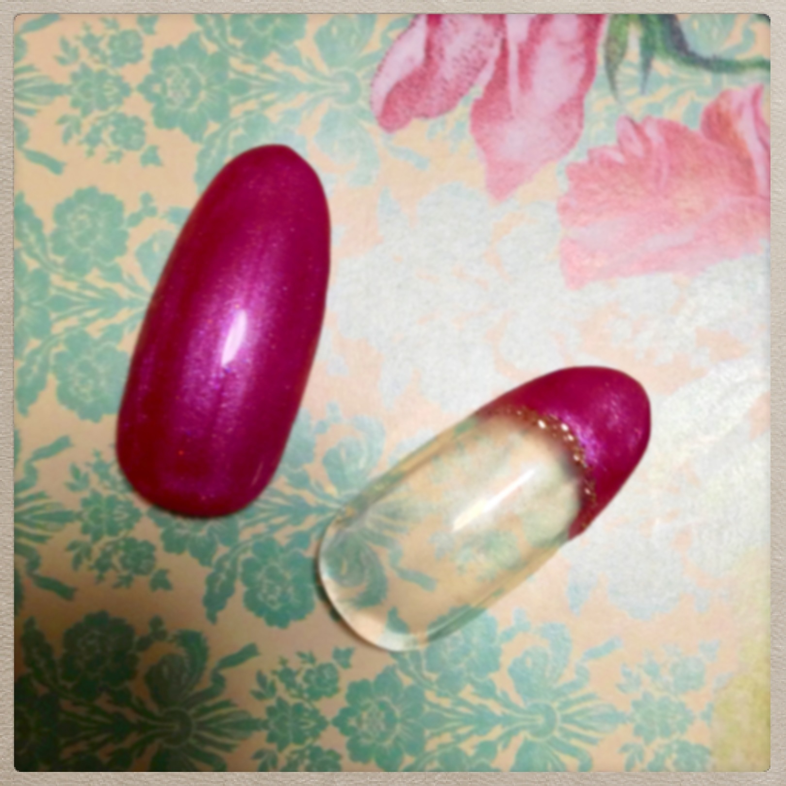 添付は本日入荷しました新色のジェルです。濃いピンクに少しパールが入っています。上品です。