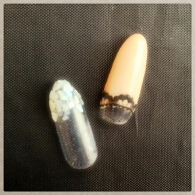 添付は先日入荷しましたクラッシュシェルと黒レースのシールです。きらきら、上品に。