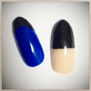 添付はバイカラーネイルです。海外の方のネイルを見ていると、考えつかないような配色ばかりで驚きます。でもとってもカッコイイのです。