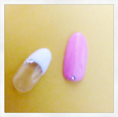 添付はピンクの一色塗りにフレンチネイルです。今日はとことんシンプルに。控えめにストーンを乗せています。